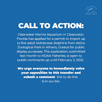 *You can comment here: https://www.regulations.gov/commenton/NOAA-NMFS-2024-0140-0001 / Example comment you can use or edit, here: "I strongly oppose the application to transfer up to five bottlenose dolphins from Greece to Florida. Transporting these dolphins such a long distance poses significant risks to their health and well-being, including stress, dehydration, injury, and even death during transit. These dolphins have already endured lives of exploitation and deserve the opportunity to live out their remaining years in peace. A more compassionate and humane alternative exists relocating the dolphins to one of the planned dolphin retirement facilities in Greece, on the islands of Lipsi or Crete. These locations are less than 200 miles away and would provide a safe and natural environment for the dolphins to recover and thrive. Approving this transfer would only perpetuate the exploitation of these sentient and intelligent beings for public display. I urge NOAA Fisheries to deny this application and prioritise the welfare of these dolphins above commercial interests".- Αρχιπέλαγος [rosa, dnews, avgi]